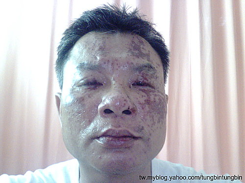 3月1日於工廠操作自動造液機,由於自動造液機高壓管爆裂,大量強鹼噴於臉上,導致頸部以上臉及雙眼被強鹼嚴重灼傷,經送台大斗六分院再轉送彰化基督教醫院,再於成功大學醫學院斗六分院住院治療,於今天終於出院了,感謝成功大學醫學院斗六分院眼科林耀華醫生為我醫治,雖然受傷的眼睛可能無法恢復以前的光明,但還是要感謝林耀華醫師盡其最大的努力來為我治療,以及要感謝成功大學醫學院斗六分院裡的阿惠與阿妙兩位護士,及5病房裡所有照顧過我的護士小姐,心中誠摯的感謝各位,同時也祝福各位身體安康。