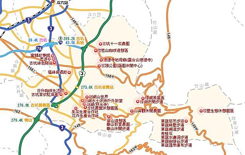 4、國道三號:古坑系統交流轉78 號快速道路→台三線(古坑)交流道下→即可到達古坑鄉綠色隧道。