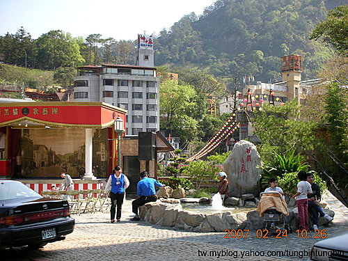 停車場旁黑貓歌藝團,還有那噴水池是溫泉喔!可以免費泡腳↓
