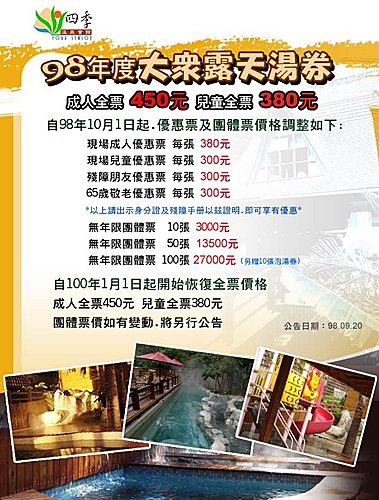 「四季溫泉會館」打造出一個擁有巴里島風情的湯泉空間,讓你不必出國就能感受出國渡假的樂趣,靜靜地泡著湯,放開所有的瑣事,可以說是生活中的一大享受