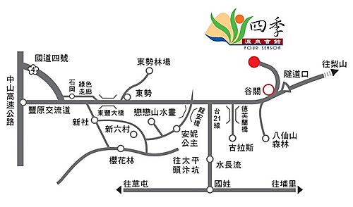 (豐原/神岡)往東直走到底;左轉接豐勢路(台八線)經東勢到谷關,