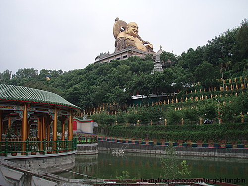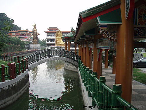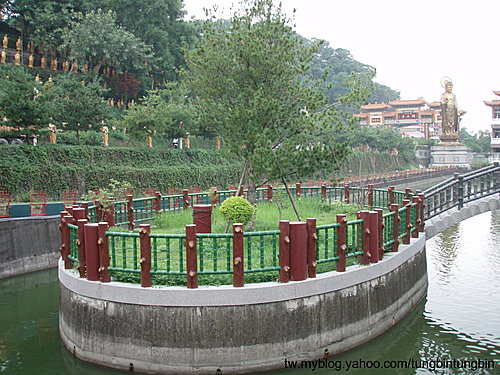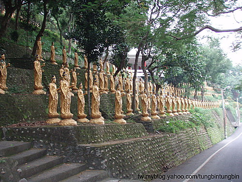 馬路旁一列的站立的觀音像倒映在碧綠的池水中,構成一幅美麗的畫面