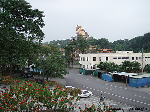 遠望湖山岩寺的彌勒佛以及彌勒佛後面像別墅群的砲兵營區↓