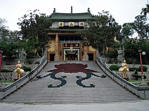 「湖山岩」主祀觀世音菩薩,環境十分清幽。寺院內闢有佛教雕塑公園,院前一潭碧綠水池