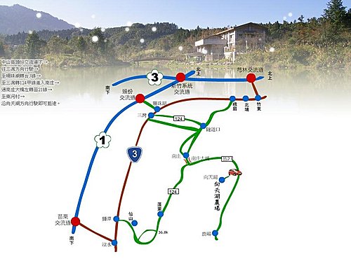 開車:中山高下頭份交流道,循1號省道南行,轉124縣道至珊珠湖,接3號省道至三灣,接124縣道抵南庄,過南庄橋後左轉往鹿場方向,循向天湖指標可抵,全程約32公里。