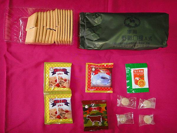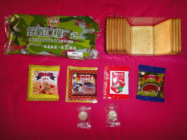 這是軍用野戰口糧A式,是不對外發售的,因大兒子在當兵拿回來的,內容為餅乾14片,營養即溶3合1 麥片2包,特選巧克力粉一包,牛肉乾一包,桔子果醬一包,薑糖四顆,我們以前的野戰口糧只有餅乾10片裝而已,現在的野戰口糧還真豐富,只不過內容怎麼好像是在哄騙小孩的食物啊!