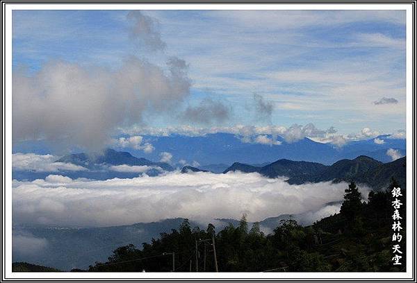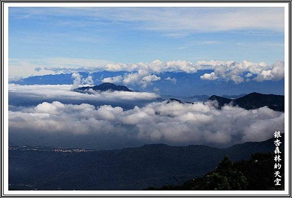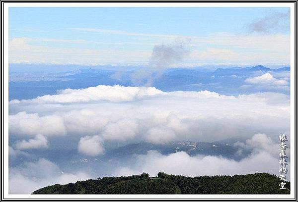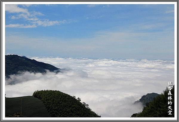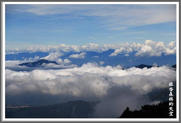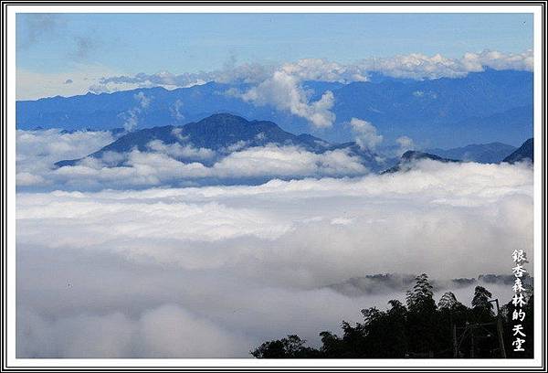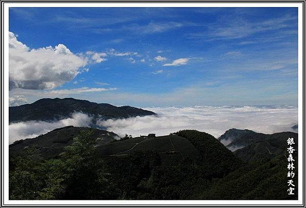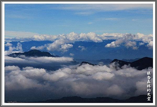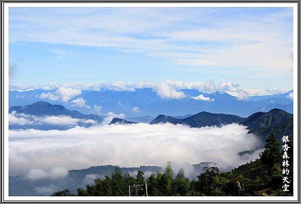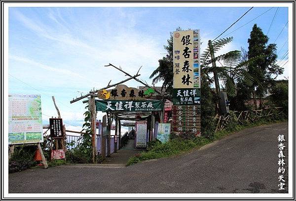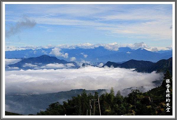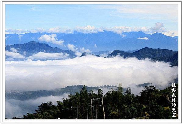 產業道路直直的走到底就是銀杏森林咖啡簡餐餐廳,車子就在餐廳門口靠路邊停車,一下車我整個人都呆住了,怎麼會有如此美麗的雲海,藍色的天空下襯著潔白的雲朵,氣流帶動雲海翻滾,仿佛就是身處一大片的滔滔白浪之上,深呼吸一口銀杏森林的芬多精,感覺滿臉都是幸福