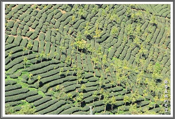 樓台與觀景台之間以木棧道串連,兩旁是猶如梯田的茶園,採茶姑娘低頭忙於茶樹之間,為這滿園翠綠增添些許的點點色彩