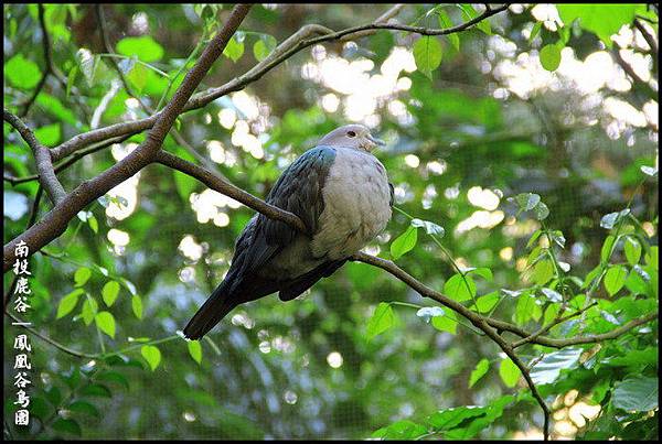 綠背鴿,鳥綱、鳩鴿目、鳩鴿科,分佈於印度、斯里蘭卡、緬甸、安達曼群島、泰國、越南、馬來西亞、菲律賓及印尼,500公尺以下的低海拔森林區,常見其蹤跡,性羞怯,常棲於高樹頂端,於晨昏方出外覓食,主食山果,特嗜野生無花果,其巢築於高地6~7公尺的高樹上,每窩只產1枚蛋,約18天出雛