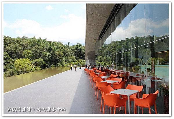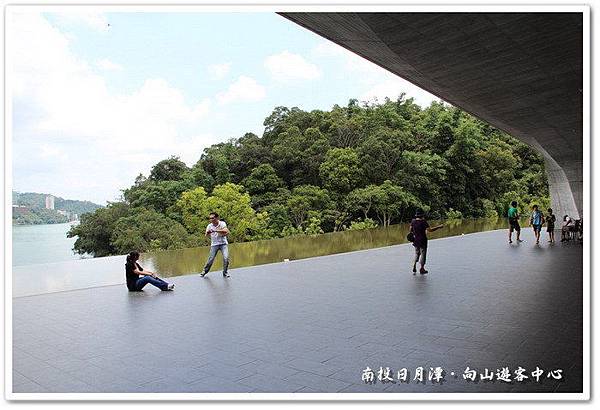 遠處路旁就是我停車的門口,園區非常的遼闊,看似很近,卻要繞很遠才能到這裡,而這裡是園區最後面的咖啡館,咖啡館擁有著與眾不同的特殊性,不僅擁有日月潭之美景,日本建築大師的前衛設計,更讓此建物在國際留名,在這裡的屋頂有沒有感覺像是人站在大型油輪底下,然後遊輪航行在日月潭上,載著旅客遊覽日月潭的風光