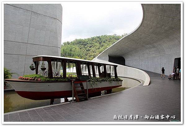 整體造型為配合日月潭原來的優美景緻,在靠近潭邊處是建築本體,到了近緩坡處轉成土壤的景色,讓整個建築與日月潭盡量結合成一體,建築採木紋清水模方式,在特殊的造型中,處處發現細緻的手法表現,遊客中心外面則是環形水池,裡面還有2座懷舊木殼船