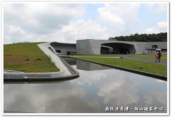 兩棟彎曲的建築物組成低矮開闊的風格,屋頂一端延伸至地面,讓遊客可輕鬆登上頂樓,欣賞湖光水色的寧靜,若從空中鳥瞰向山遊客中心,很像兩根迴力鏢平放在地面上一般,,建築周圍以帶狀水池環繞,與後方的日月潭相互呼應