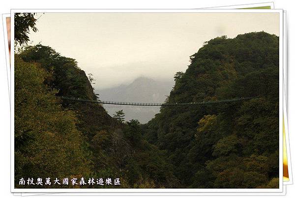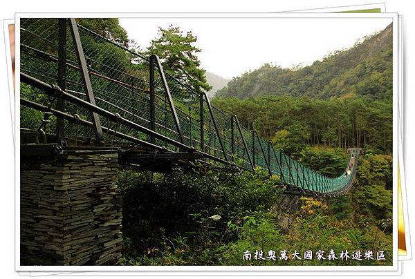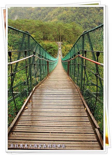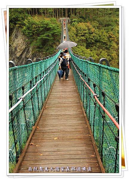 吊橋的橋身並不大,所以只好收起雨傘,免得傘尖碰觸到別人,在橋身中間雖發現美景,但因橋身晃動得太厲害,根本無法拍攝,只好放棄拍攝的念頭,只有離橋頭近一點的時候,才能穩住相機繼續拍攝
