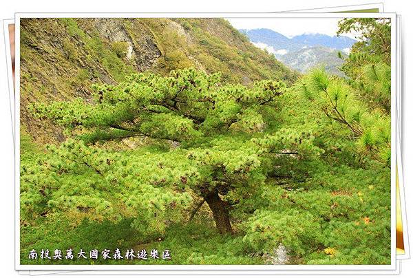 到達萬大吊橋松林區近岸時,有一棵百年青松屹立於崖邊,青翠蒼勁的青松樹上滿是結果壘壘,粗壯洗練的枝幹訴說著寒風中的滄桑,但仍不忘使勁的向上伸展,所結的果實種子及在園區裡所掉落的所有楓樹種子,皆為園區所有,請遊客勿檢拾,以免違反園區規章而觸法