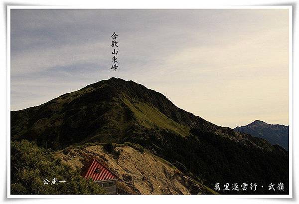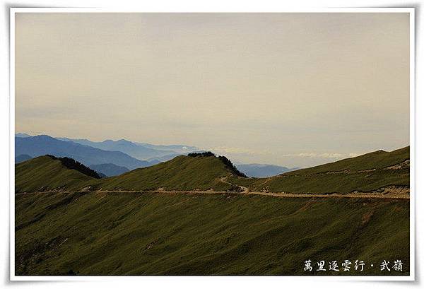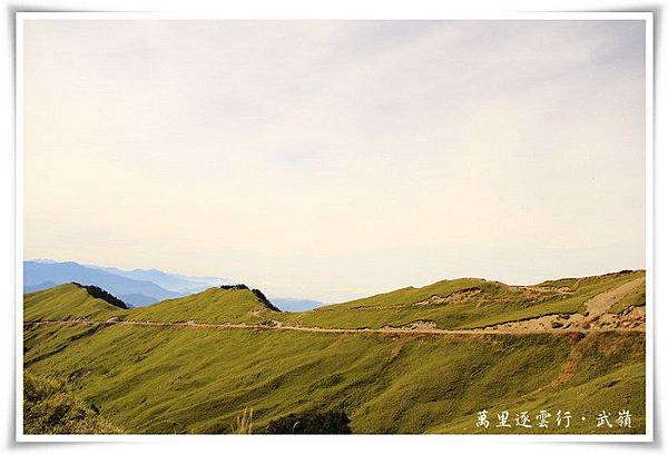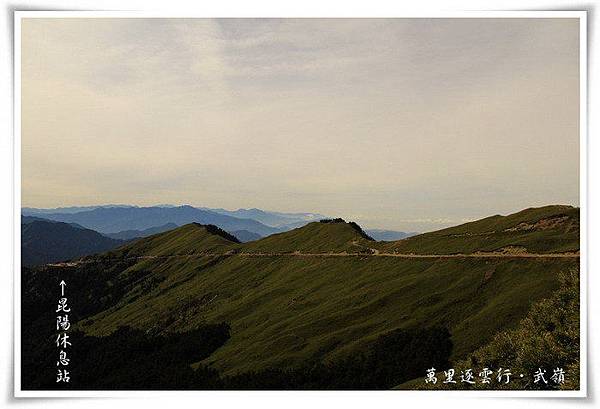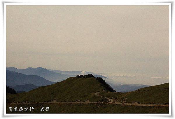 下圖即是合歡山主峰,走過昆陽休息站,再經過合歡山脈這條平緩的上坡道,就到了新中橫公路台14甲線的最高點─武嶺,眼前的這合歡山脈看起來雖是鬱鬱蔥蔥的青草地,但在雪季時的草地上,可是遍佈覆蓋著皚皚白雪的銀色世界