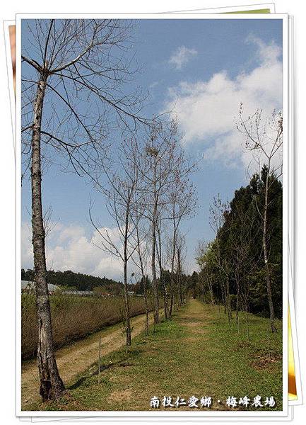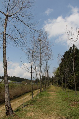 轉彎之後首先看到的是梅峰農場的『白楊步道』,一般旅遊書籍在介紹梅峰農場時,都以這白楊步道為代表性,所以很多人對梅峰農場的印象也都僅只於這白楊步道,殊不知梅峰農場的溫室一葉蘭,及桃花廊道更勝於這白楊步道的風光,不過白楊多變,一年四季有情,春天萌發新芽,夏天綠葉繁茂,秋天葉黃飄落,冬天枯枝獨立,如此週而復始,可以看盡一年四季的輪轉更替