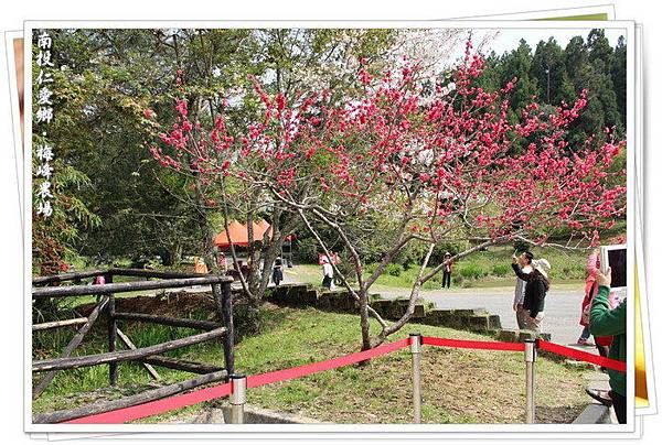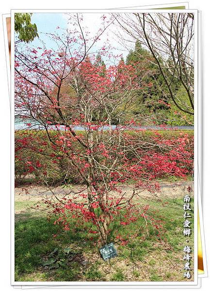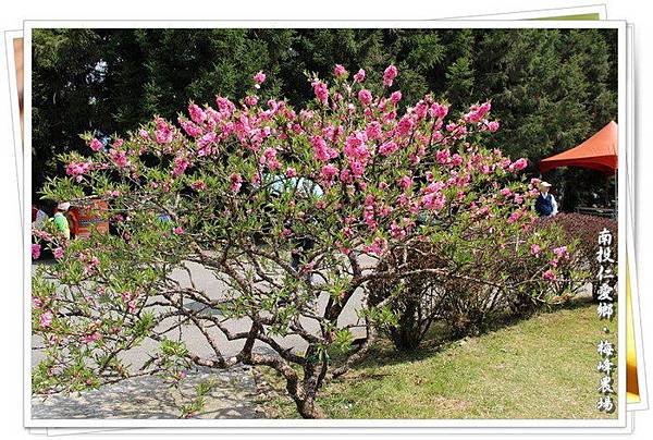 行政中心前的一株矮桃,農場中總共出現四株矮桃,一株在入口的伴月坡,另一株在桃花廊道裡,另一株在停車場旁,這株是第四株,全部都是王母娘娘種的蟠桃,也是桃花中最豔紅漂亮的桃花