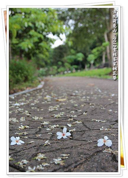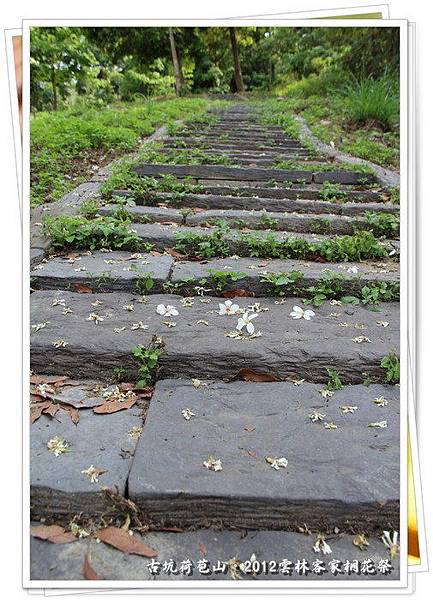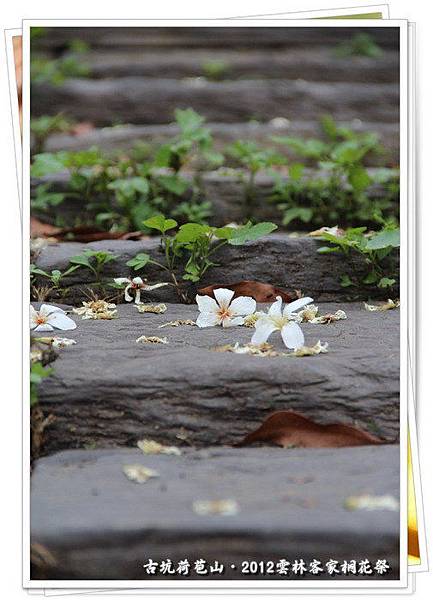 步道台階上的桐花一朵朵,是我對妳愛無止盡的承諾,穿越夢的距離,與時間的洗禮,讓飄落一地的相思裝滿簍!