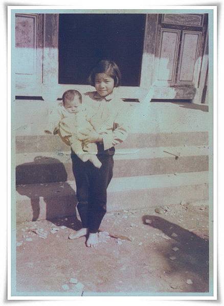這是二妹小時候的照片,拍攝於我家三合院旁的村廟,此廟現已拆除,日據時代強征民地所建的廟,如今已還地於我們,目前是我大伯的樓房所在,二妹手裡抱的正是么妹,寒苦的年代,父母上田工作,小孩子就只能照顧小小孩囉!
