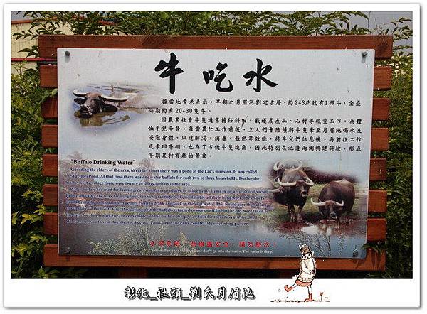 農業社會時期牛隻通常擔任耕田,載運農產品及石材等粗重工作,為體恤牛隻辛勞,每當農忙工作前後,主人們陸續將牛隻牽到月眉池喝水浸泡身體,等牛兒休息夠了,再前往工作或牽回牛棚,也為了方便牛隻進出,因此特別在池邊兩側興建斜坡,形成早期農村有趣的景象