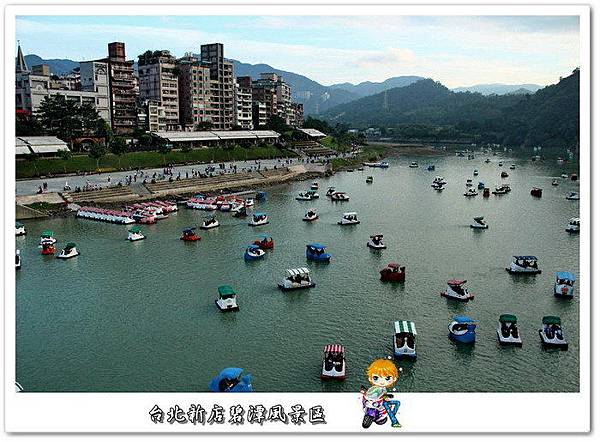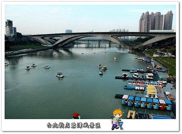 遠處北二高的弧形橋墩倒映在綠波的碧潭之上,彩色船隻點綴在河岸,無限的風情將碧潭襯映得多彩多姿