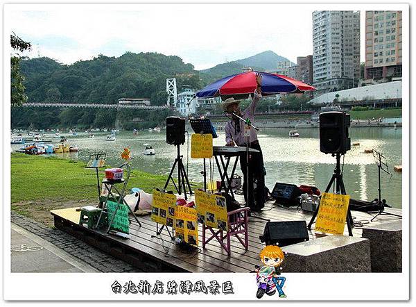 橋下有一位阿伯街頭藝人,彈琴唱歌兼拉客,抱歉!他拉的不是皮條,他是為教唱彈琴而招生,還有英文教唱班喔!阿伯的足跡遍及中永和、大稻埕、新店碧潭與北科大,是位電子琴樂器教學的全能街頭藝人
