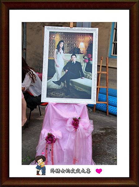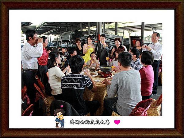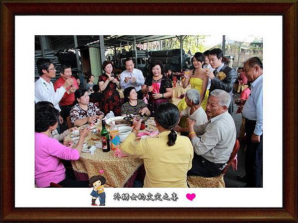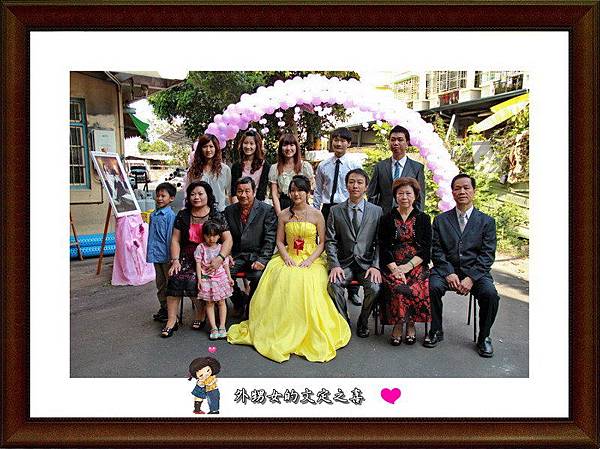 既然已結成親家,兩家就來個大合照,前排右起親家公、親家母、新郎、新娘、姊夫、姊姊大女兒的女兒、姊姊、姊姊大女兒的兒子。後排右起新郎的大哥、姊姊的小兒子、三女兒、四女兒、大女兒
