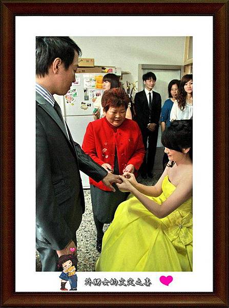 奉甜茶後吉時良辰已到,新郎新娘開始交換戴戒指,『新娘坐乎正,才會得人疼』。『雙腳抬高高,生子中狀元』。『手指掛對對,夫妻萬年大富貴』。穿紅色衣服的是我們這邊的媒人婆,一看就知道天生要來當媒婆綽合所有情人終成眷屬的