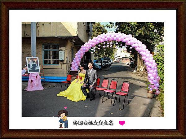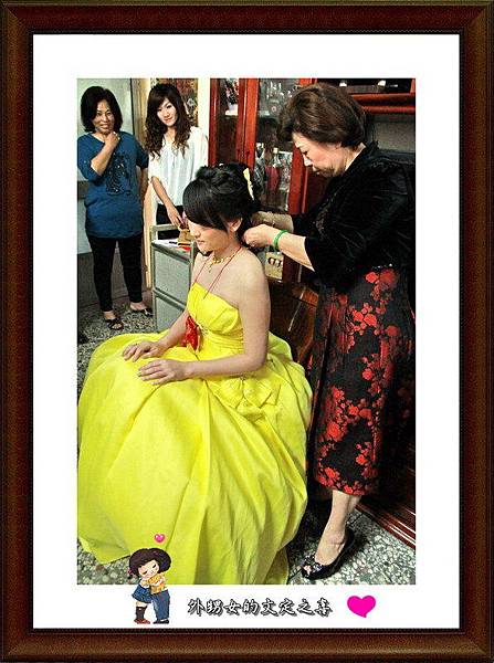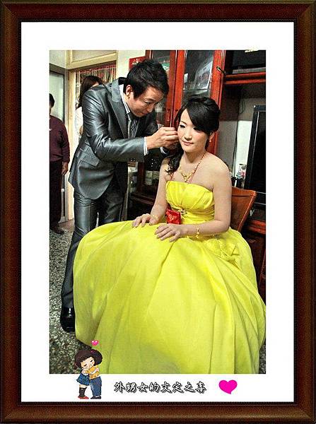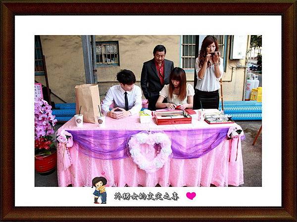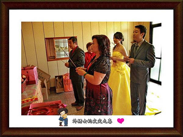 綉菀是我姊姊的二女兒,大女兒已出嫁,我這個唯一的舅舅理所當然得去參加,並且充當攝影師,全程記錄這一輩子的幸福。『手捧甜茶講四句,新娘好命蔭丈夫;奉敬家官有上取,田園建置千萬區』。上圖最裡面坐著那位是公公,中間是婆婆,最外面這位則是新郎官,旁邊幫忙的是新郎那邊的媒婆