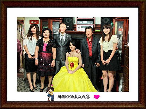 接下來的幸福合照,左一是新郎的舅舅,左二是新郎的父親,左三是新郎,右三是新娘,右二是新郎的母親,右一是媒人婆