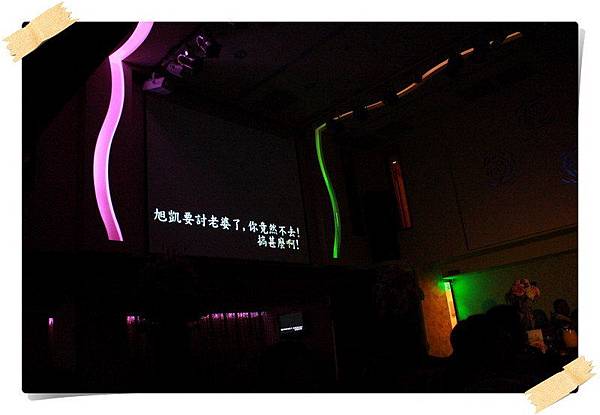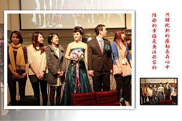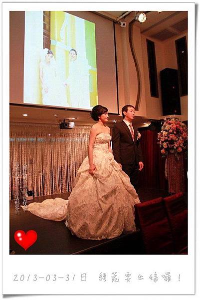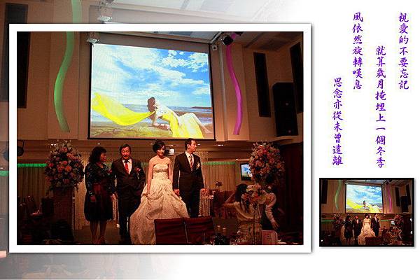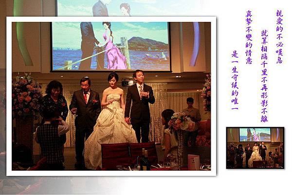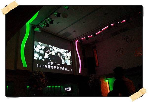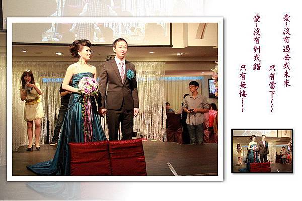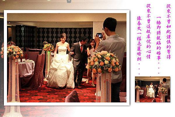 在婚宴開始前先來一段彩排,以下新娘穿白紗禮服的照片是採排的經過,至於實際的婚禮則只有穿綠色禮服的兩張,必竟當母舅的我,坐在主桌上總不能像在自家一樣,又拿起相機狂拍一番,當母舅總得要端莊一點