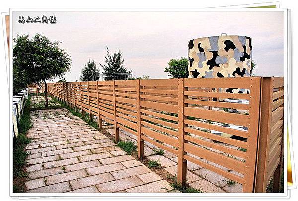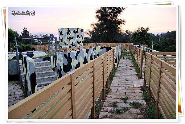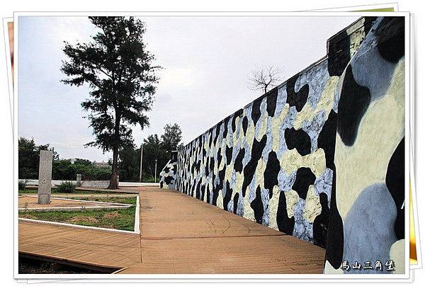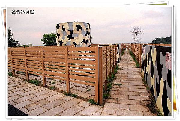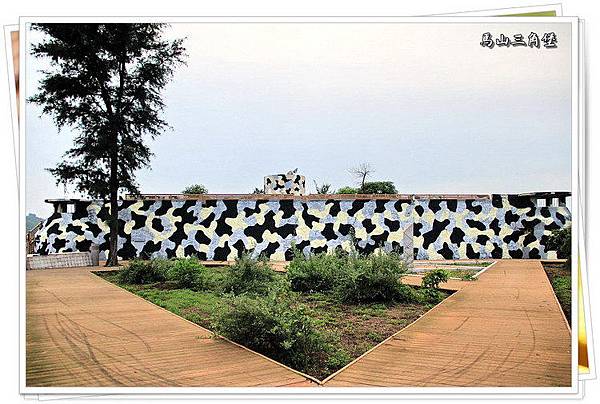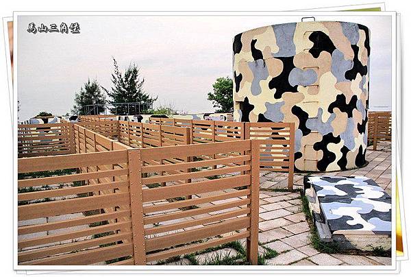 三角堡前方的塑木地板,建置一個昔日在金門從軍的弟兄,軍服肩臂上所繡的等腰三角形臂章一樣,三角形內又有一個倒三角形,變化出四個三角形,三角堡的錯綜複雜三角形,還好不是三角戀愛,不然這三角習題還真的是難分難解。註:軍服上三角形臂章代表的是駐守金門地區,金東、金西、南雄、烈嶼四個師的微妙關係