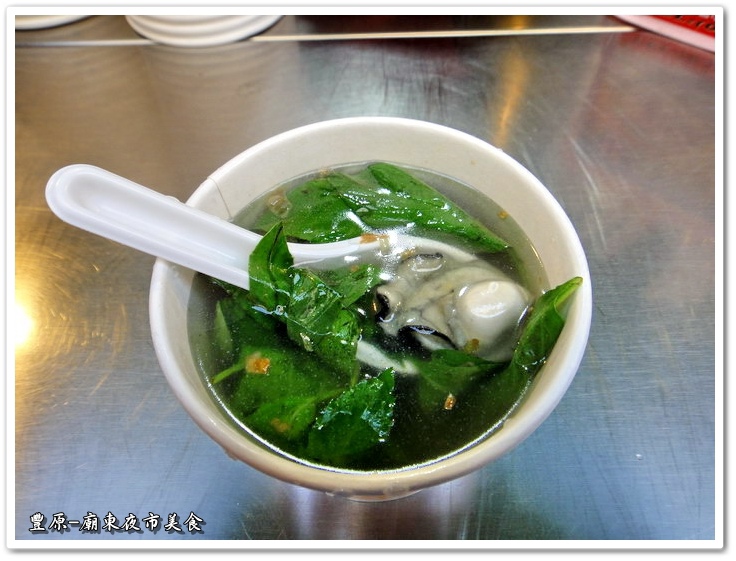 但是這攤的『蚵仔鏈湯』跟我們的料理方式有點不一樣,我們是以蚵仔裹上地瓜粉的原味方式,上桌前只加上少許的香油其它一概不加,而這碗『蚵仔鏈湯』則是九層塔加得太多,導致九層塔掩蓋過蚵仔的自然香氣