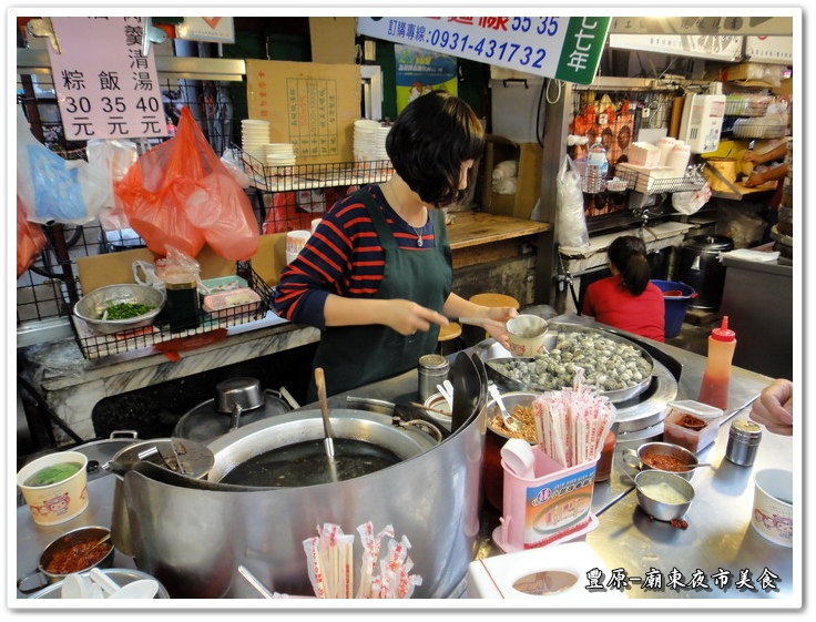 這一攤賣的是『蚵仔鏈湯』45元,蚵仔湯一般市面上都是以薑絲或酸菜的方式料理,很少人會用蚵仔鏈的方式料裡,其料理方式則跟我們在家裡料理蚵仔的方式一樣