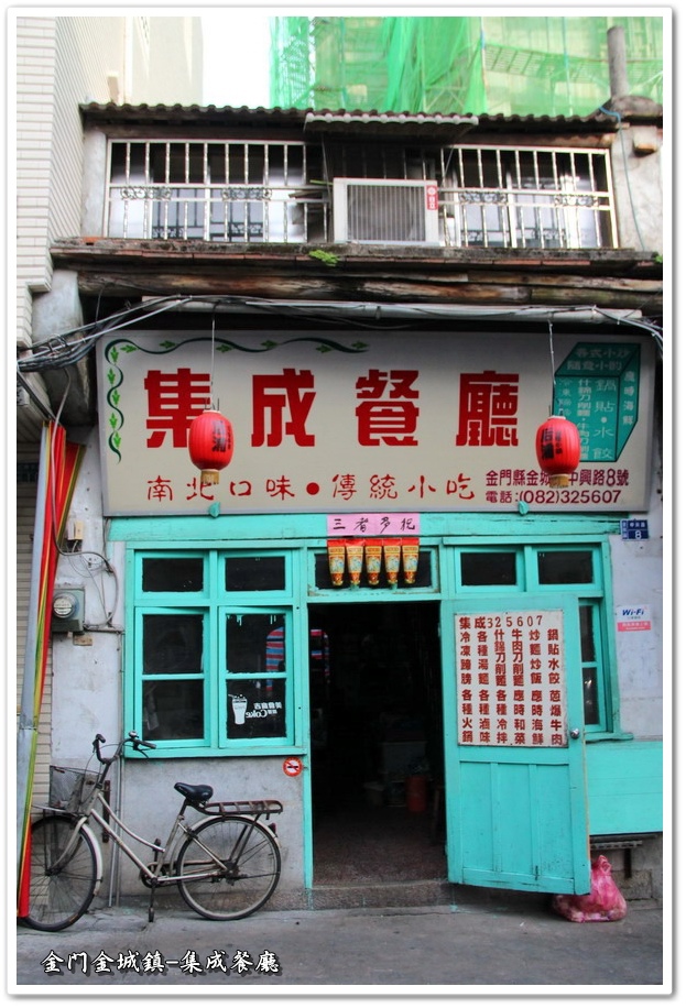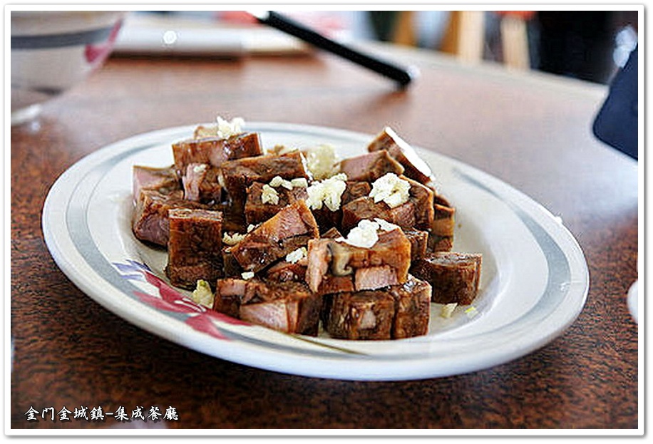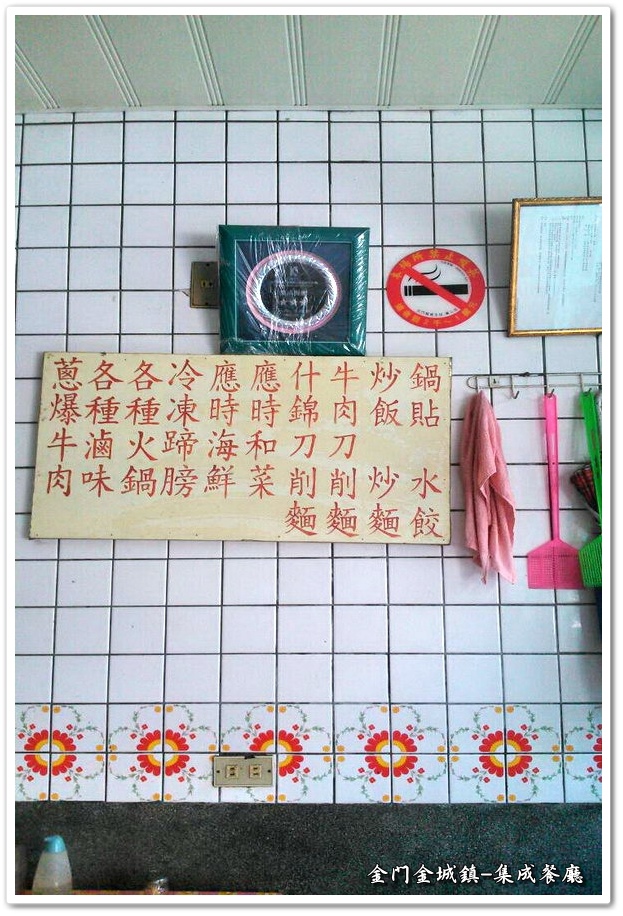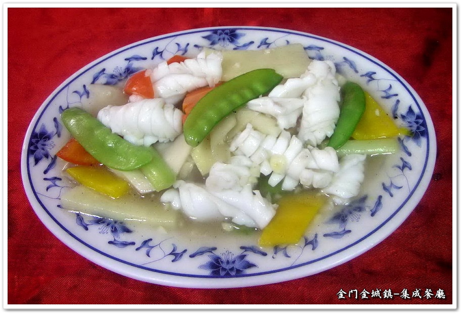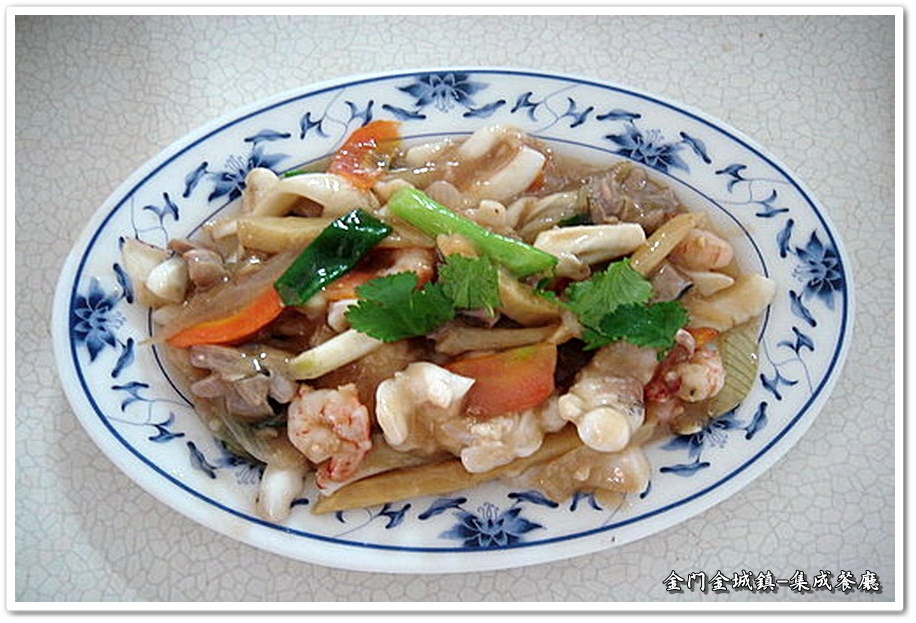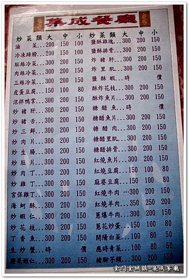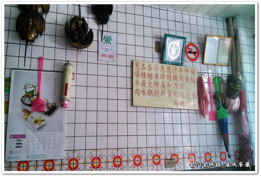 上圖『集成餐廳』牆壁上藍綠色的獎章,是有如『米其林餐廳』的識別標章,是金門縣府自行標識的三★★★級美食認證規章。而因為剛好網友『小紅帽』在這間餐廳裡任職,所以事先與『小紅帽』取得聯繫,表明我與老婆會在第二天中午到達『集成餐廳』吃飯,所以才會從金門東半島趕回到西半島的『集成餐廳』來享受美食