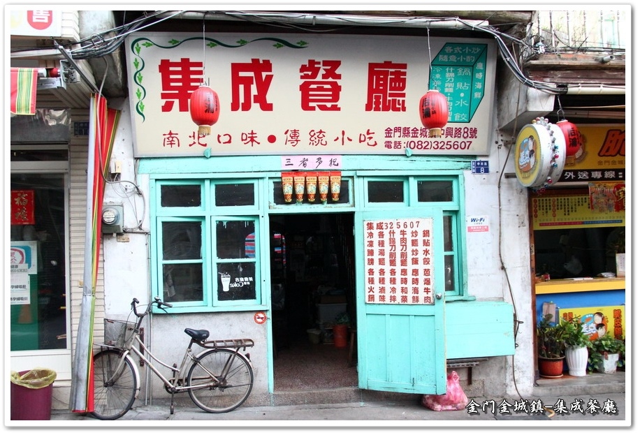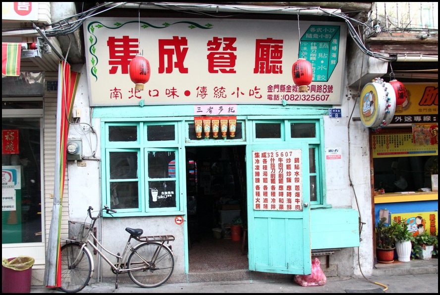 『集成餐廳』地址:金門縣金城鎮中興路8號,電話:082-325-607,無固定公休日,營業時間:11:30-14:00,17:00-21:30。招牌菜:『招牌鍋貼、冷凍蹄膀、什錦刀削麵、炒麵、海蚵酥、紅燒魚片』等。其他如『南北口味、傳統小吃,各式小炒、應時海鮮』等應有盡有