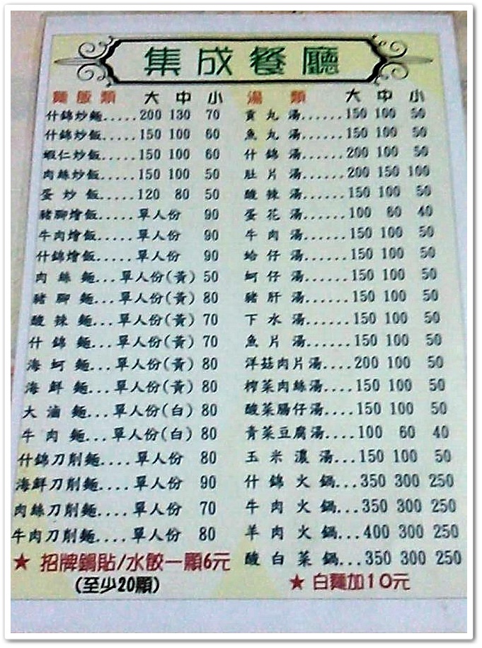 集成餐廳的『招牌鍋貼』很多客人慕名而來,招牌鍋貼個頭大,外皮酥脆,內餡飽滿,一粒是6元,老闆說為響應成本,瓦斯很貴,所以最少要點20顆才要下鍋,所以如果自己吃不完20顆,建議幾人合買比較不會浪費