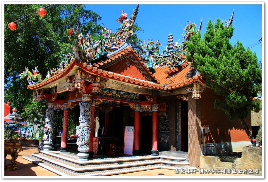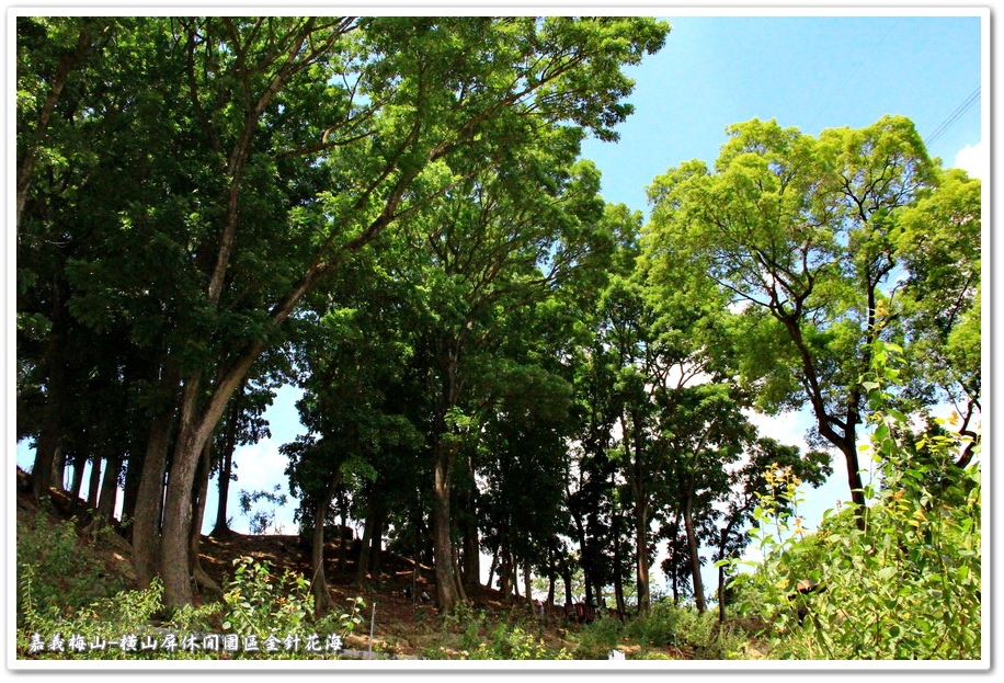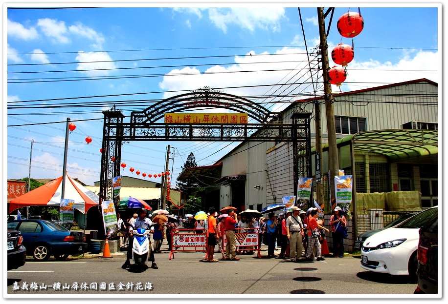 5月15日早上的天氣豔陽高照,晴空萬里,相信是拍金針花海的大好時機,我隨即提著單眼相機隻身前往,從國三高速公路梅山交流道下,往梅山市區行走,在台3省道266.9K處中油加油站前,即見到『橫山屏休閒園區』的鐵拱門,由鐵拱門進入來到達梅山『鎮安宮』只須半小時的時間