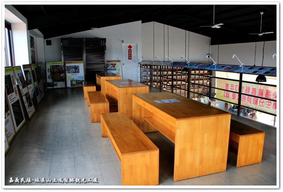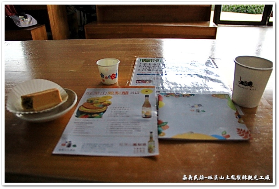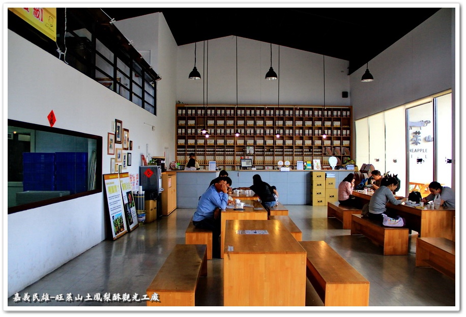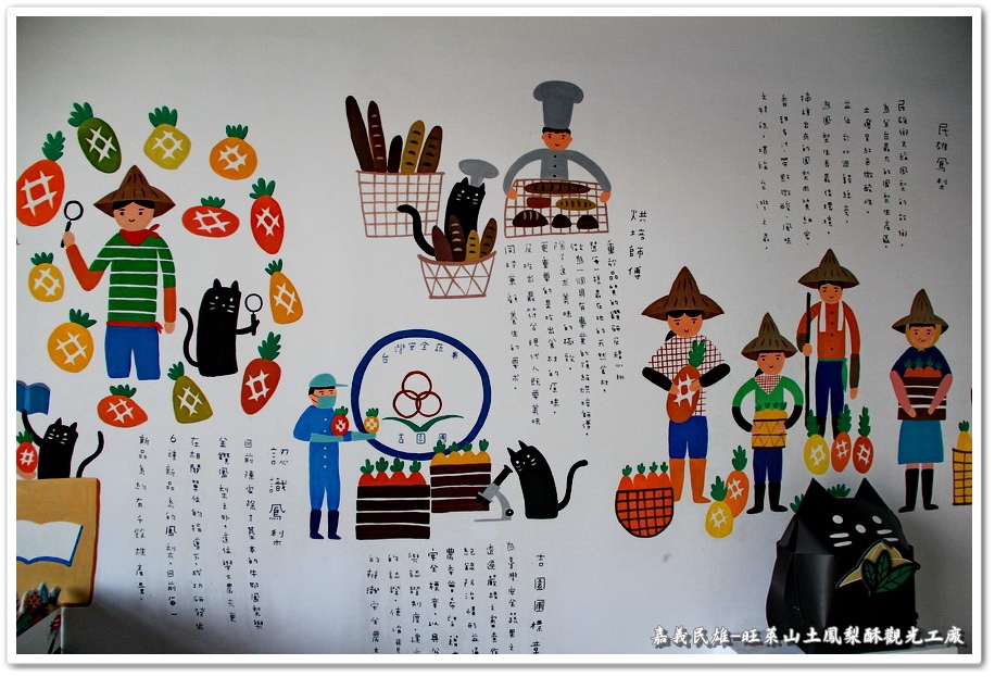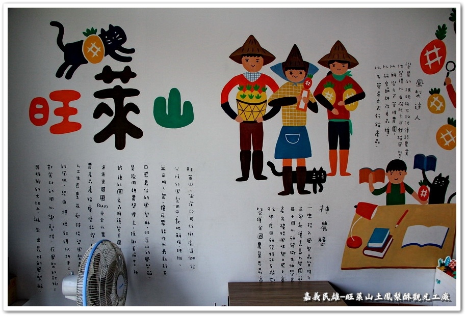 牆壁上的圖畫解說很像是國小課本,感覺很有趣就把它拍下來。『旺萊山』坐落於民雄鄉廣達700餘公頃的鳳梨田中,採用神農獎鮮食鳳梨,通過吉園圃(GAP)安全水果認證,絕不添加任何人工生長素(荷爾蒙),並堅持保留鳳梨最佳原始的風味,在鳳梨的故鄉『民雄鄉』的土地上,誕生出最好的鳳梨酥