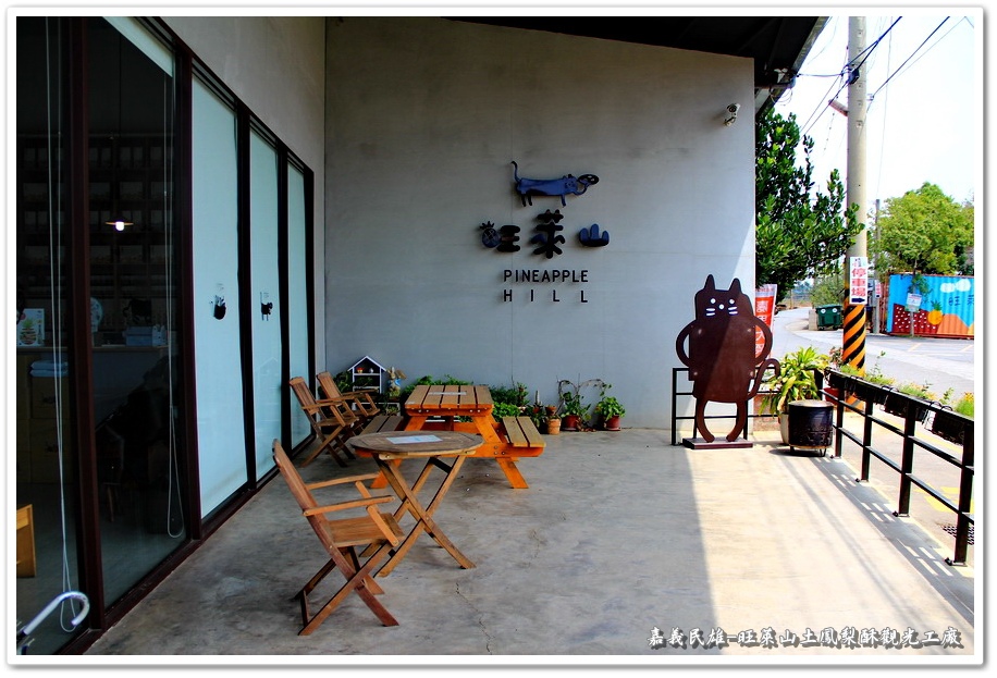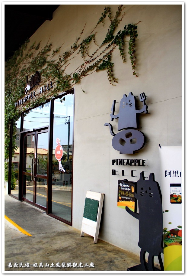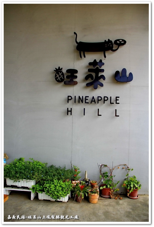 『旺萊山土鳳梨酥觀光工廠』門口未何會設計這麼多可愛造型貓咪來做招牌,與大家分享一個小典故,因為高雄以前俗稱『打狗』,民雄古時俗稱『打貓』,所以旺萊山特別設計了一個被鳳梨打到的貓,讓『旺萊山』更添加了許多趣味性