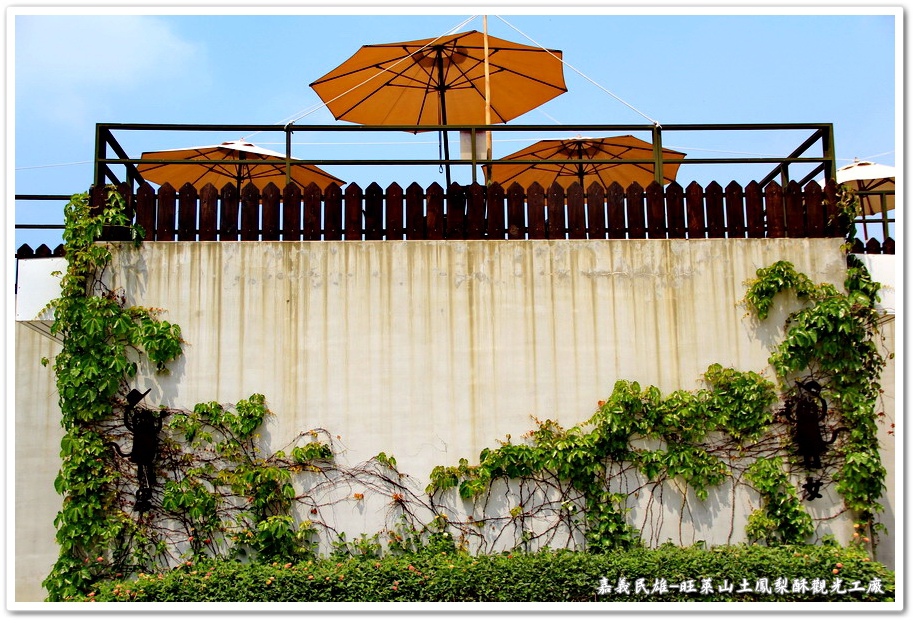 停好車之後就來先進入裡面參觀,首先看到『旺萊山土鳳梨酥觀光工廠』這一棟建築,很有綠色建築之感,牆壁沒有過度的粉刷,而且還爬滿了綠色藤類植物,深咖啡色的窗框,清水泥灰色的牆壁,加上綠色的植物,很有清新文人雅致的感覺