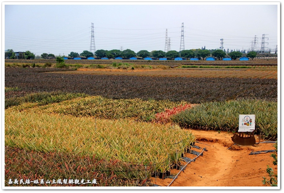 在戶外觀景台往廣大的鳳梨田拍攝,整齊的鳳梨田看起來剛新種不久,也可能為了區別收成時程,每一區的鳳梨栽種時間不同,還有品種的不同,所以才產生了不同顏色的區塊