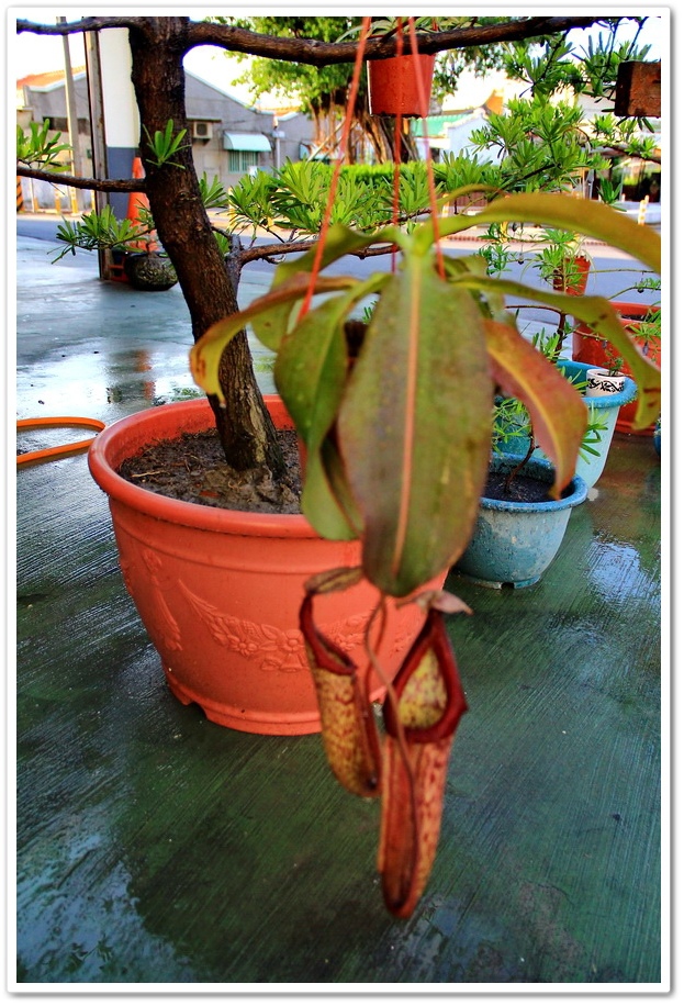 在民居前方拍下這一株『豬籠草』的植物,『豬籠草』是一種能夠捕食昆蟲的多年生草本植物,主產地是熱帶亞洲地區。其為地生植物,是攀援狀的亞灌木。『豬籠草』擁有獨特的吸取營養的器官『捕蟲籠』,捕蟲籠呈圓筒形,下半部稍膨大,因為形狀像豬籠,故稱『豬籠草』。在中國的產地海南又被稱作『雷公壺』,意指它像酒壺。這類能夠通過捕捉和消化昆蟲等小動物,來獲取營養的植物被稱為食蟲植物