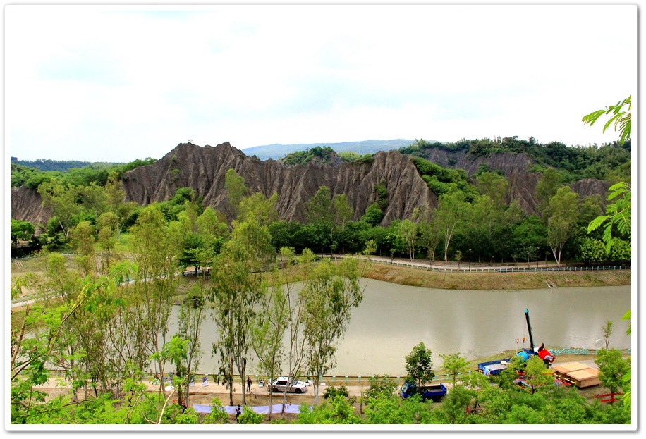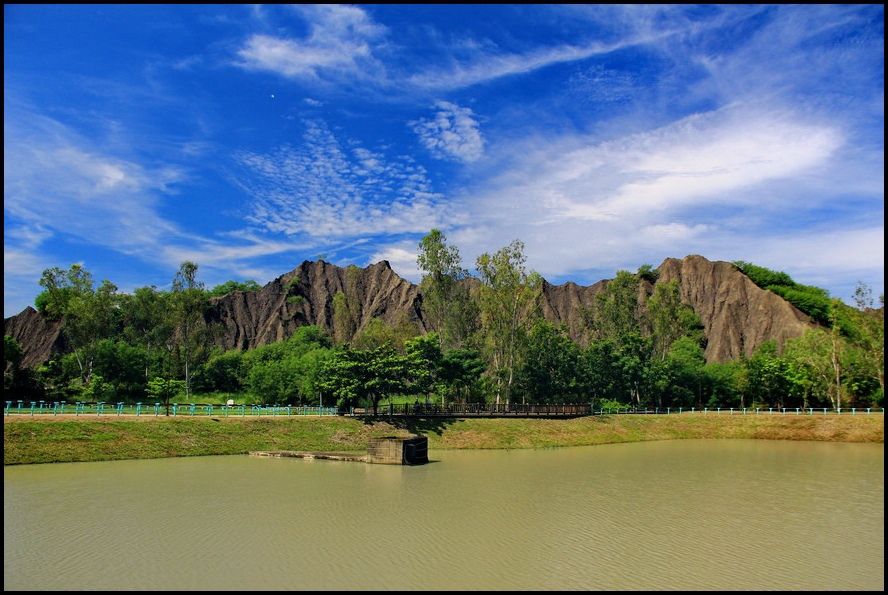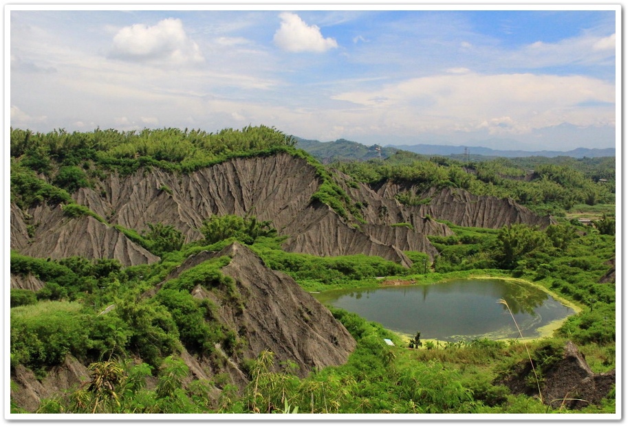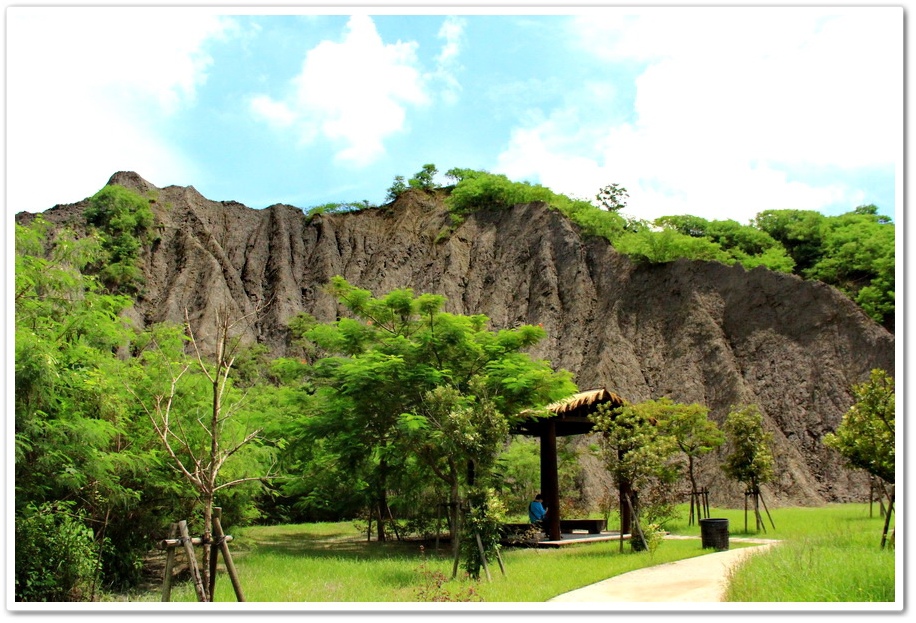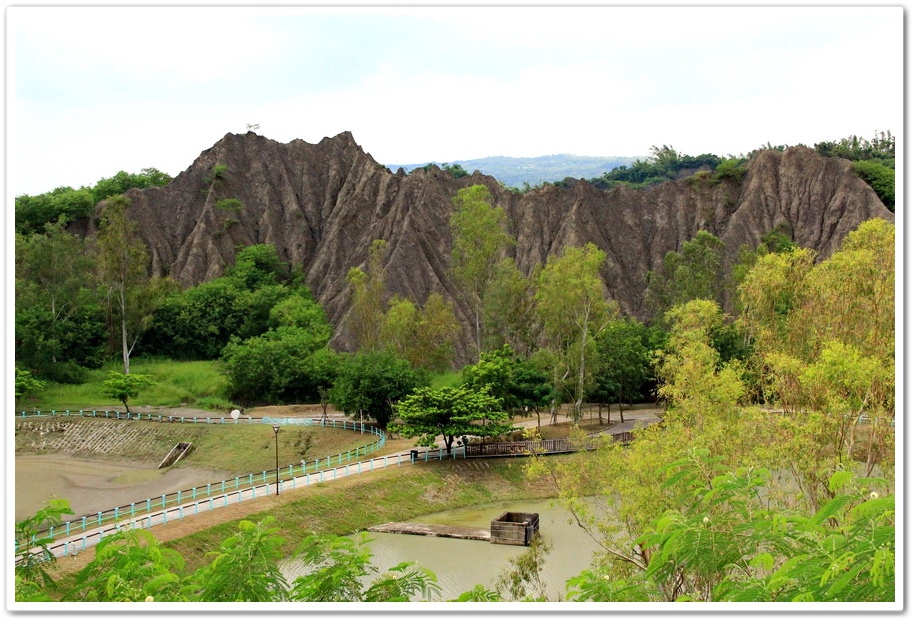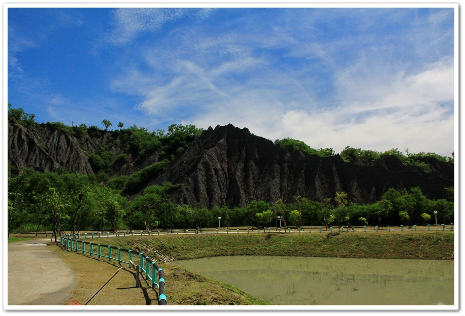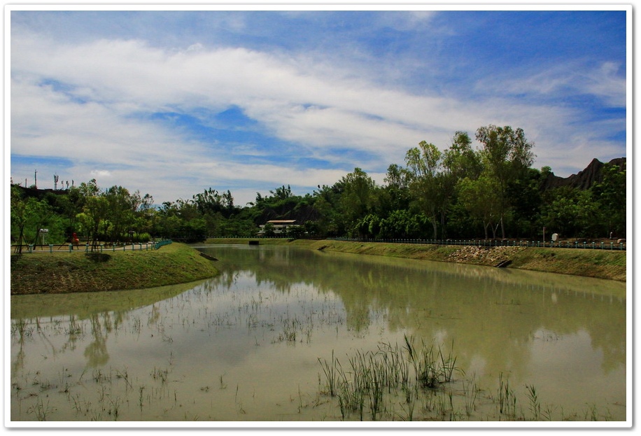 不過既然來了,那就到處走走吧!或許我能在此尋找出記憶認知裡的蜘絲馬跡,遠方是『田寮月世界』裡入口處的『玉池』,由環湖步道被一分為一大一小的『玉池』,水質澄靜時,則能倒映遠處的泥岩景觀