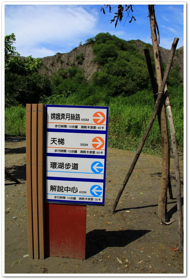 在環湖道路上設有指示牌,往前750公尺直走是261階的木棧梯,上方有2座瞭望臺,1座觀景臺,之後是421階的『嫦娥奔月絲路』,下坡之後是月世界地景公園最著名景點『五里坑』