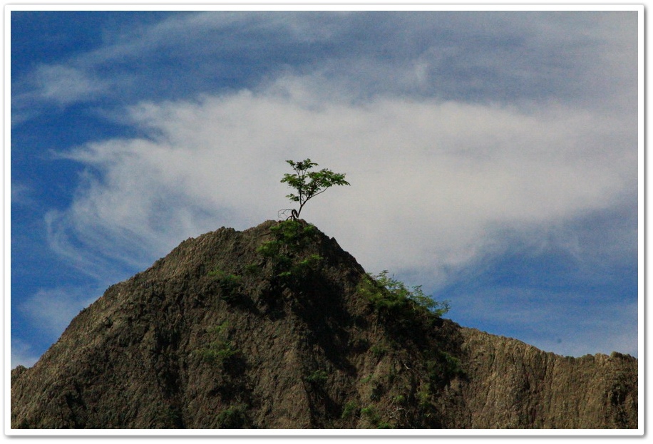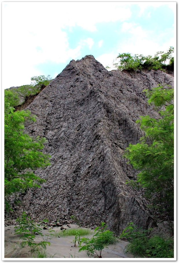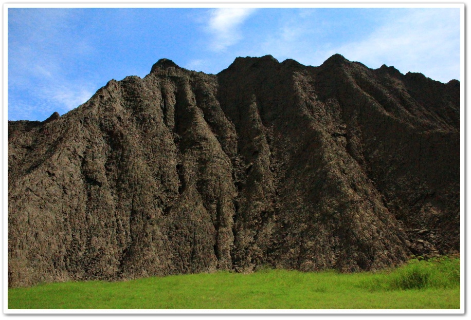 泥岩惡地裡草木不生,泥地乾枯時的表面,就像恐龍的皮膚,同時上圖泥岩的形狀,又很像一隻恐龍的頭部,所以讓我戲稱此泥岩為『惡龍怒地』