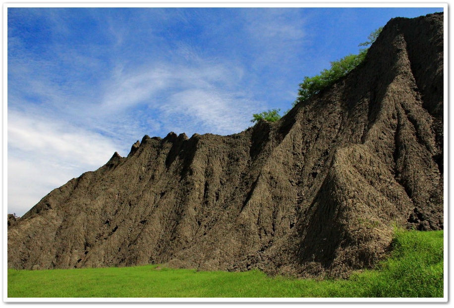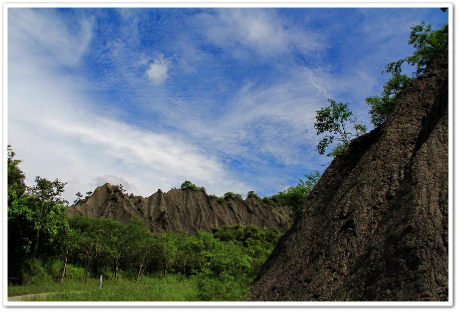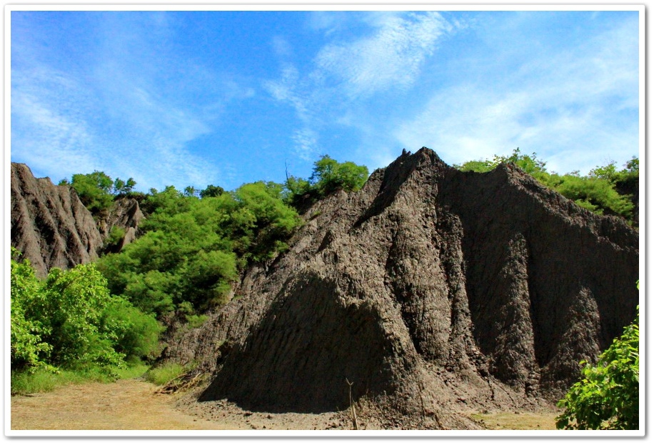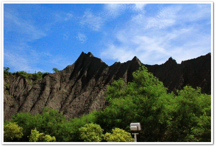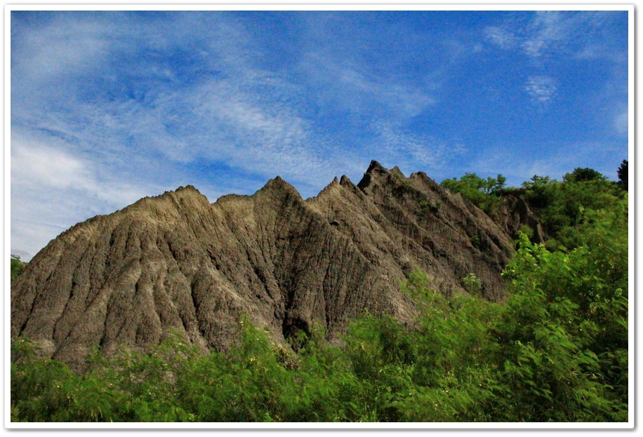 因此在乾、雨季的曝曬風化、崩解及侵蝕、流失的交互作用下,部分地區表層有版狀剝離滾落的現象,除形成陡峭坡地外,更切割出一道道鋸齒狀的山脊和V型侵蝕溝,逐漸形成奇特的尖銳嶙峋的泥岩地形景觀