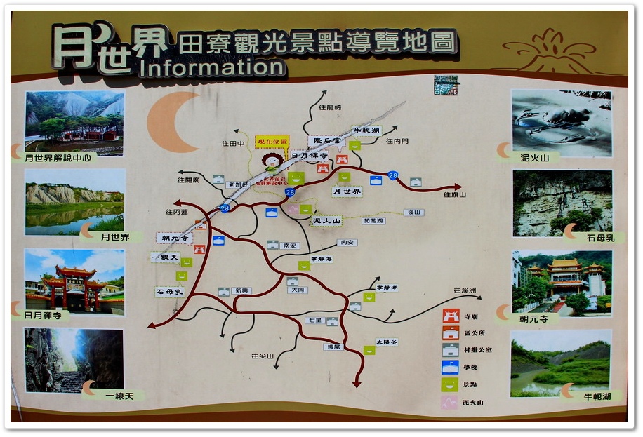 ★ 自行開車:國道一號由路竹交流道下,續行184縣道至崗山頭再行5公里可見標示,沿指標續行即可到達田寮月世界。