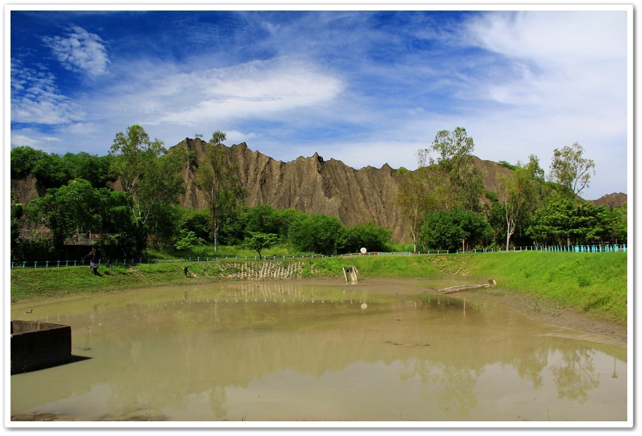 玉池本身是做為滯洪池所用,由於惡地經年累月遭受雨水與河水的沖刷,大部分的時間都是呈現乾枯狀,適逢雨季到訪,玉池中積滿了雨水,看著水中的倒影,這時刻的月世界,景緻其實還蠻迷人的