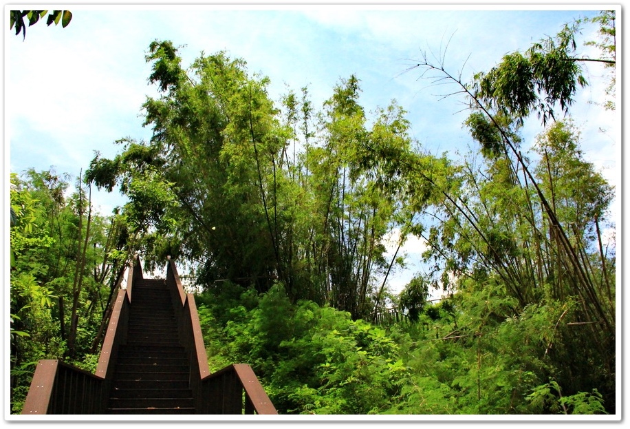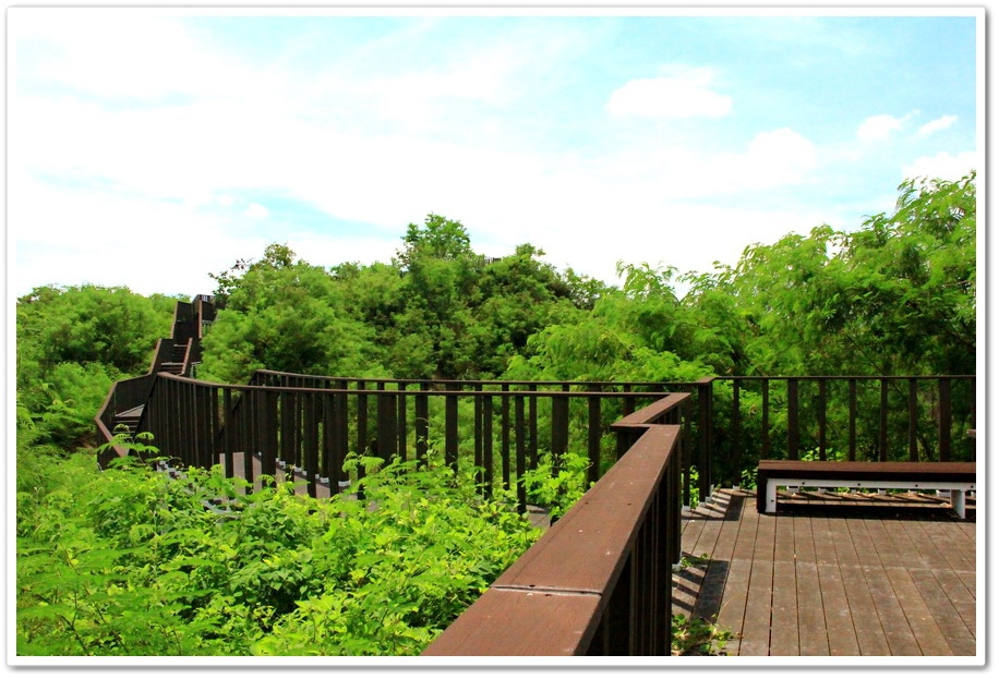 這裡是園區的中心點,就是剛才公共廁所往右的道路,現在開始往園區另一邊通往『月池』的『天梯』走,爬上156階的木棧道就是『月池』